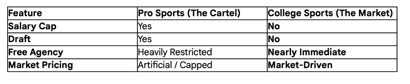 A top college QB today has more labor freedom than a mid-tier NFL veteran. He can solicit competing offers, move immediately, and re-price his value annually. Pro sports spent decades securing legal exceptions and controlling labor and suddenly college sports blew that all up.